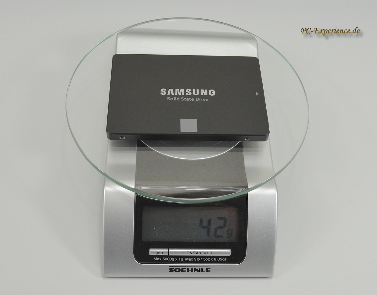 Unsere Waage präsentiert 42 Gramm, auch das liegt in etwa auf dem Niveau des Vorgängers (Samsung 840 Pro 54 Gramm, Samsung 840 EVO 43 Gramm). Eine Corsair Neutron GTX wiegt beispielsweise 47 Gramm, eine OCZ Vertex 4 wiegt im Vergleich 91 Gramm, Crucials MX100 wiegt 64 Gramm und eine etwas ältere Intel 510 knappe 80 Gramm. Die Unterschiede erklären sich nicht nur durch den Materialeinsatz, sondern natürlich auch dadurch, ob eine SSD einseitig oder doppelseitig mit Nandflash-Bausteinen bestückt wurde oder nicht. Aber ob nun 50 oder 150 Gramm, ein SSD Einbaurahmen wird keinesfalls vor unüberbrückbare Herausforderungen gestellt, große 3,5" Festplatten ab 1TB aufwärts wiegen dank ihrer aufwendigen Mechanik nicht selten bis zu 700 Gramm und darüber hinaus.