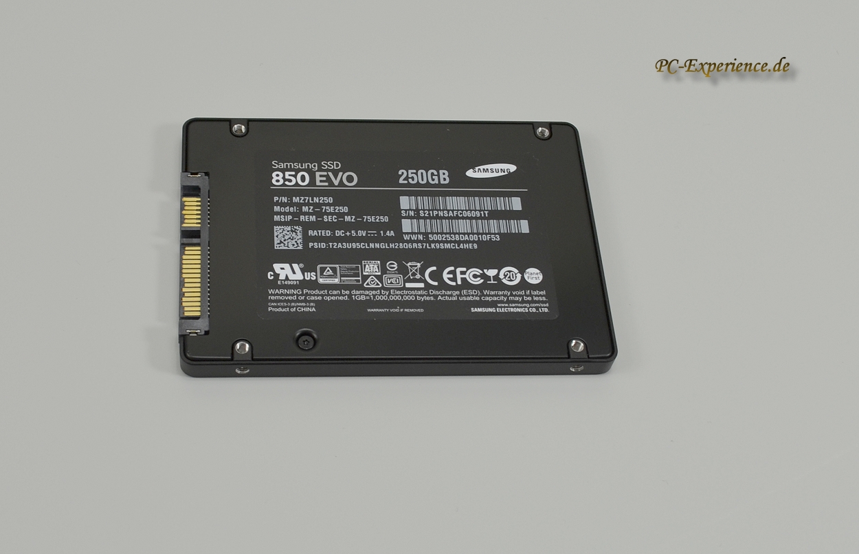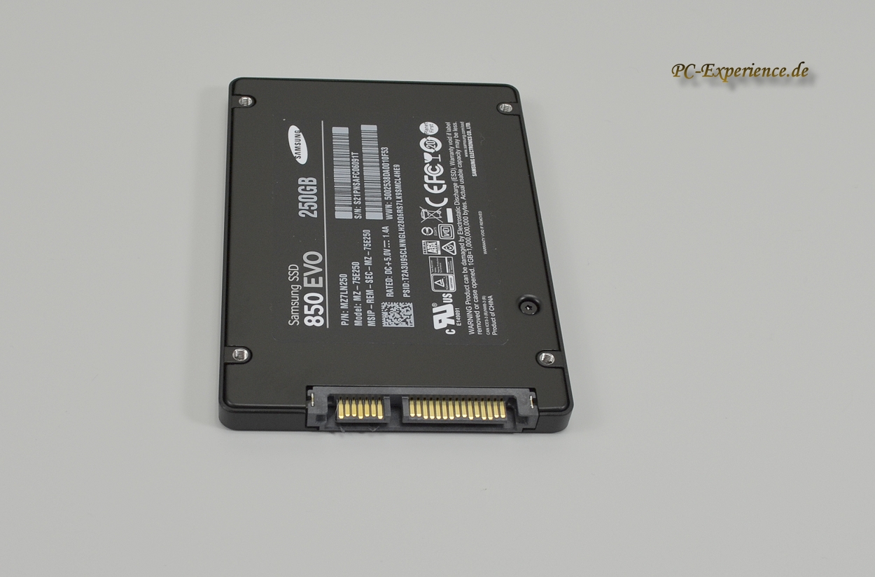 Die Dicke des Gehäuses mit ihren 7mm spielt eine wesentliche Rolle bei einer eventuellen Aufrüstung von Notebooks, nicht alle Notebooks oder Netbooks sind in der Lage, die standardisierten 2,5" SSDs mit 9mm dicken Gehäusen aufzunehmen. Es existieren einige Geräte beispielsweise von HP, Lenovo oder Dell, die lediglich 2,5" Schächte besitzen, in denen nicht mehr als 7 mm Platz existiert. Also informiert euch bitte vorher, welche SSDs für eure Notebooks einbaubar wären, die Samsung 850 EVO und Pro SSDs verfügen unisono über ein 7 mm Gehäuse, so dass es trotz wenig Platz in einem handelsüblichen Notebook zu keinerlei Einbauprobleme kommen sollte. Auf der Rückseite der SSD finden wir zwar einige krypitische Zahlen und Vermerke, aber leider keinen Hinweis auf die implementierte Firmware. Dies werden wir aber mit Hilfe unserer Tools herausfinden, wie ihr im Testkapitel noch sehen werdet. Nun ist das an sich noch kein Problem, trotzdem aber unglücklich gelöst, denn so muß der Kunde die SSD zunächst in ein laufendes System integrieren, um herauszufinden, ob ein Firmware Update nötig ist oder nicht. Der Hintergrund ist mehr als einleuchtend: wer verzichtet schon gern auf ein per Firmware Update nachgereichtes elementares Feature oder beseitigte Bugs? dabei sollten wir auch berücksichtigen, das ein Firmware Update immer auch das Risiko eines kompletten Datenverlustes beinhaltet und und nichts wäre ärgerlicher, als Windows fertig installiert zu haben und nach einem Firmware Updates von vorne anfangen zu dürfen. Ansonsten existiert kaum Kritik an der Verarbeitung, die Passgenauigkeit der Anschlußleiste ist vorbildlich. Die Anschluss-Ports liegen auch nicht zu eng nebeneinander, so dass auch etwas anders konzipierte SATA-Datenkabel mit üppgigeren Isolierungen und Sicherheitslaschen aus dem Zubehör verwendet werden könnten.