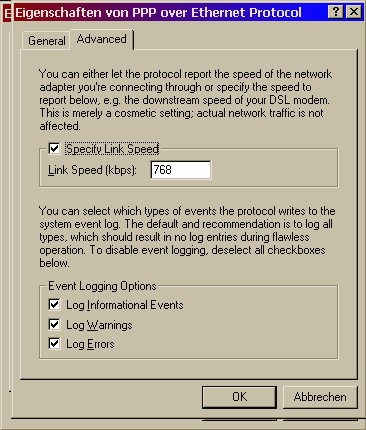 Windows zeigt in diesem Bereich die Geschwindigkeit an,die RASPPPOE mitteilt und das ist diejenige,die der Netzwerkkartentreiber meldet !
