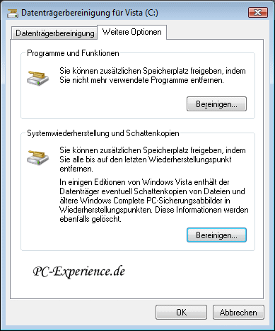 Ein Klick auf den Button weitere Optionen bringt euch zur Bereinigung der Systemwiederherstellung, Schattenkopien, Complete PC Sicherung und weiterer Deinstallier-Funktionen von Vista: