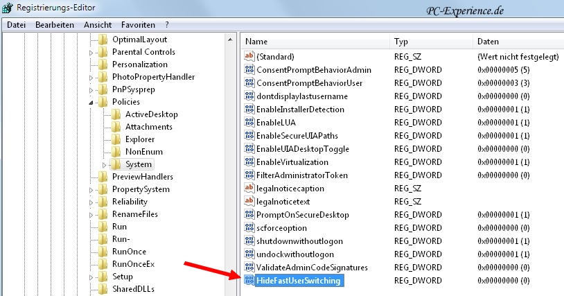 hier angekommen markieren wir im linken Teilfenster den Schlüssel System und suchen im rechten Teilfenster nach dem Eintrag HideFastUserSwitching. Dieser sollte den Wert 0 besitzen. Steht er auf 1, ist der Benutzerwechsel deaktiviert und muß von uns geändert werden, in dem wir ihn doppelt anklicken und entsprechend korrigieren.