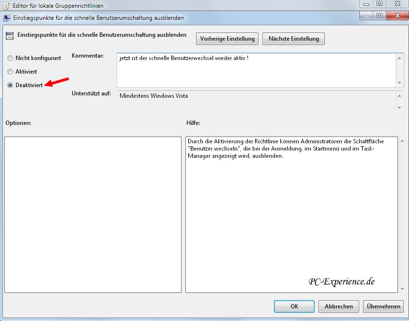 Damit wäre auch die zweite mögliche Option für den schnellen Benutzerwechsel abgearbeitet. An dieser Stelle nochmals der Hinweis: laßt die Finger von Tuning-Tools oder anderen angeblichen "Heilsbringern" für euer Windows 7. Was dabei herauskommen kann, haben wir ja grad wieder gesehen...