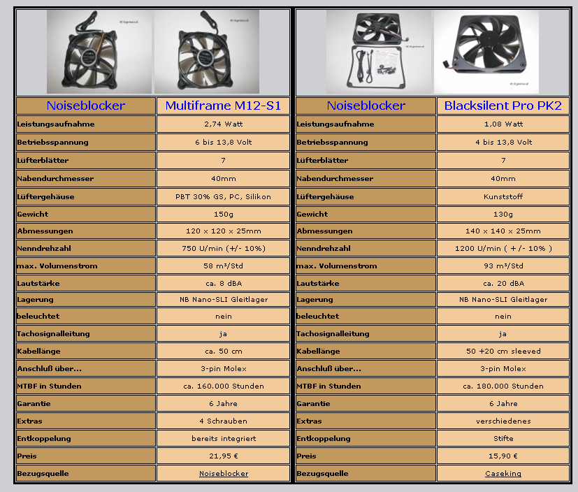 Wir haben vor dem Test für unsere Referenz-Lüfter für uns selbst eine ganz klare Maxime erstellt, es sollten keine Brüllwürfel oder Volumenmonster verwendet werden, die im Betrieb einen Kopfhörer zwingend voraussetzen. Die Lüfter sollten eine ausgewogene Mischung aus möglichst geringer Lautheit, hoher Laufkultur (Lagerqualität), guter Scalierbarkeit (Spannbreite der möglichen Voltansteuerungen) und trotzdem noch annehmbarem Förder-Volumen mitbringen. Alle diese Attribute vereinen die Noiseblocker Multiframe M12 und Noiseblocker Blacksilent Pro PK2 in sich, darum stellen sie zur Zeit für jedes Gehäuse das absolute I-Tüpfelchen dar.