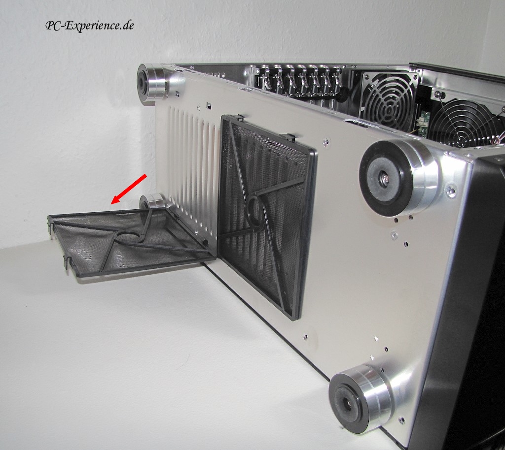 Viel ist aber bekanntlich nicht alles und so stehen wir wieder vor einem teuren Lian Li Gehäuse, in dem ohne aufpreispflichtige Adapter keine 2,5" und SSD-Laufwerke verbaut werden können. Wir haben mitunter den Eindruck, diese schon häufiger von uns vorgetragene Kritik perlt ab, wie Wasser auf einem nanoversiegeltem PKW-Lack. Das gilt gleichermaßen für den Netzteil Staubfilter unter dem Gehäuse, den jemand mit Bandscheibenvorfall kaum allein reinigen kann, denn dazu muß das Gehäuse gekippt werden und das ist auch bei einem vollbestücktem Alu-Tower keine Kleinigkeit.