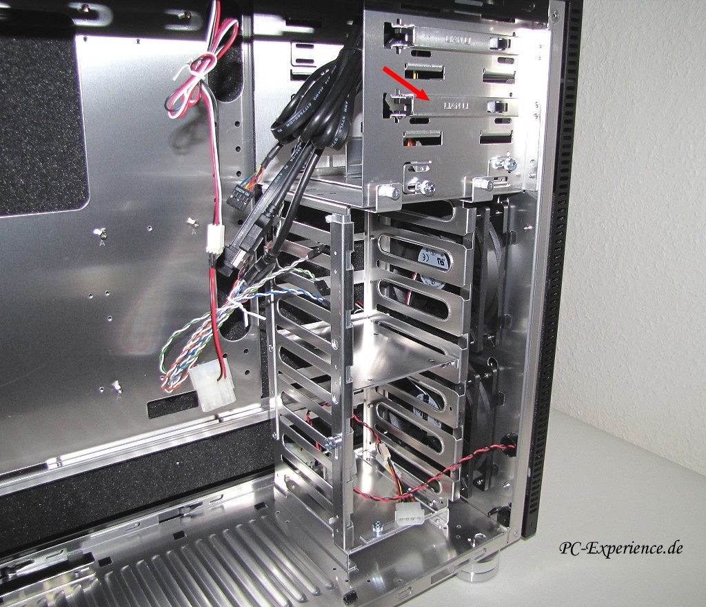 Der durchgehende Festplattenkäfig kann nach dem Lösen entsprechender Thumbscrews entnommen werden, das hilft bei der Komplettierung ebenso, wie beim Ausbau der Lüfter. Darüber hinaus erleichtert die lüfternahe Positionierung zusätzlich den Einbau langer Grafikkarten und schafft eben auch den entsprechenden Platz für diese Platinen, wobei es über 280mm hinaus trotzdem sehr eng wird, euer Grafikkarteneinkauf sollte also darauf ausgerichtet sein.