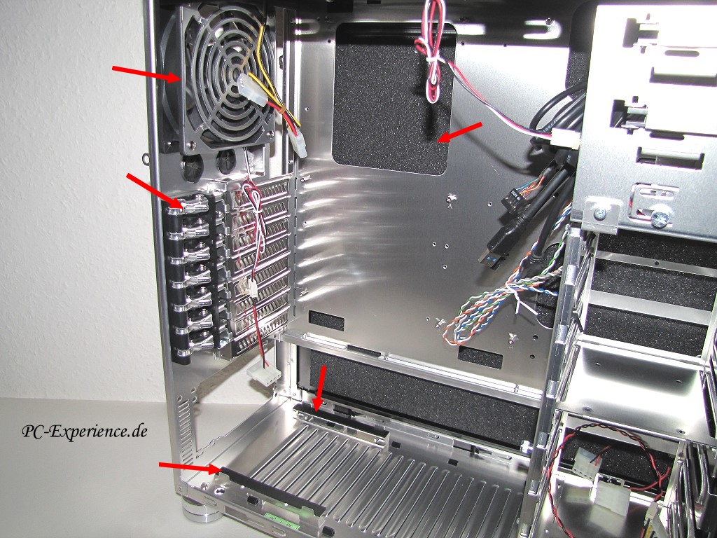 Die Lufthutzen im Heck und auf dem Gehäusedeckel mindern die subjektive Geräuschempfindung ein wenig. Wesentlich mehr bewirkt es allerdings, das Lüftergitter des 120mm Hecklüfters und des 140mm Lüfters im Deckel zu entfernen, denn die verwirbeln deutlich vernehmbar. Das gilt auch für die Aluverkleidung der Frontlüfter, wir hatten den subjektiven Eindruck, das die Lüfter unter 12 Volt vorne zum Pfeifen neigen, was sich nach dem Entfernen der Verkleidung sofort verflüchtigte. Der Luftdurchsatz verbesserte sich nach dem Ausbau des Aluprofils ebenfalls merklich.