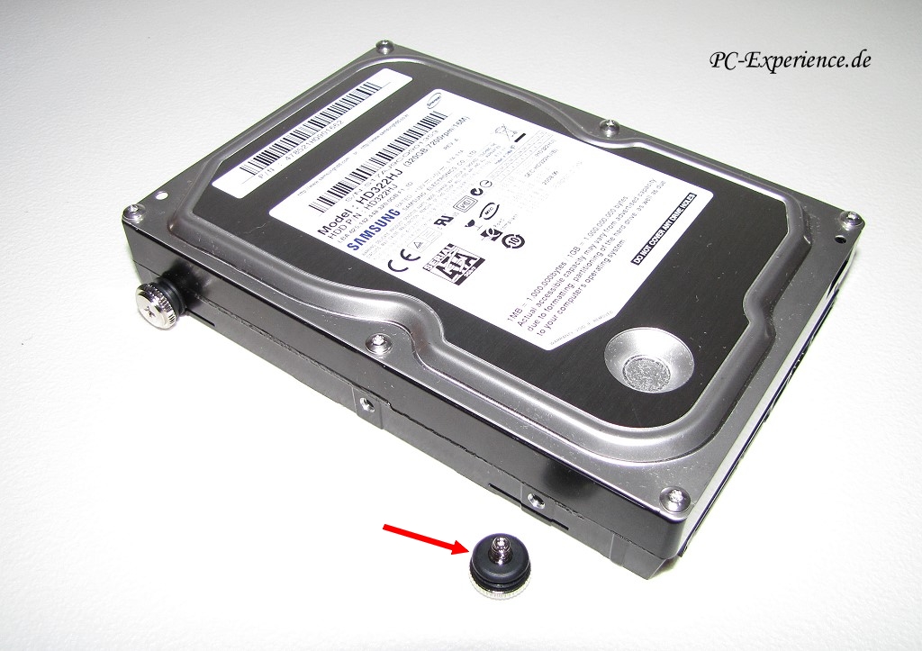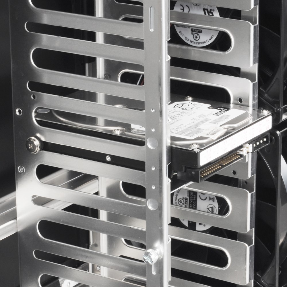 Der Festplattenkäfig kann wie bereits erwähnt abgeschraubt werden, die Festplatten lassen sich aber auch ohne die Demontage des Käfigs einbauen. Dazu benötigen wir kein Werkzeug, einfach die vorgesehenen großkopfigen Rändelschrauben mit den Gummies versehen, in die Festplatte einschrauben, die Arretierungsschraube des Käfigs lösen und die Festplatte vorsichtig einschieben. Abschließend sollte die Arretierung des Käfigs wieder fixiert werden. Leider läßt der Käfig keine variable Positionierung der Festplatten zu, sie können lediglich mit dem Anschlußterminal zum Betrachter eingesetzt werden (siehe Bild), so daß eine Verkabelung nach hinten heraus schwierig wird. Reduziert werden durch die Entkoppelung aber lediglich mögliche Vibrationen, eine Dämmung der Festplatte zur Reduzierung der Zugriffsgeräusche findet so natürlich kaum statt, da sind professionelle Speziallösungen deutlich im Vorteil. SSDs werden in dieser Integration wieder einmal nicht berücksichtigt, ein Umstand der kaum akzetabel ist.