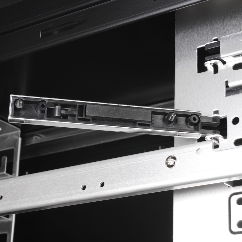 Hinter den Laufwerks-Blenden befinden sich keine weiteren Blenden, die womöglich auch noch herausgebrochen werden müssen. So kann das Gehäuse immer wieder in den Auslieferungszustand zurückversetzt werden. Die Blenden als solche weisen eine hohe Passgenauigkeit auf und lassen sich leicht und überwiegend kratzerfrei klemmen. Die Integration der optischen Laufwerke kann, wie bereits erwähnt, entweder über die seitlich Entkoppelungshebel erfolgen, oder über die traditionelle Verschraubung, beide Optionen sind gleichermaßen praktikabel. Wir empfehlen beides, also auf der einen Seite die Hebel und auf der anderen Seite vier Schrauben, damit konnten wir im Test die besten Ergebnisse herausarbeiten, denn je nach Laufwerk kann die einseitige Fixierung über den Hebel eventuell nicht ausreichen. Wir haben natürlich grundsätzlich Laufwerke mit schwarzer Frontblende verwendet, damit die Corporate Identity nicht unterbrochen wird und die Farbgebung stimmt.