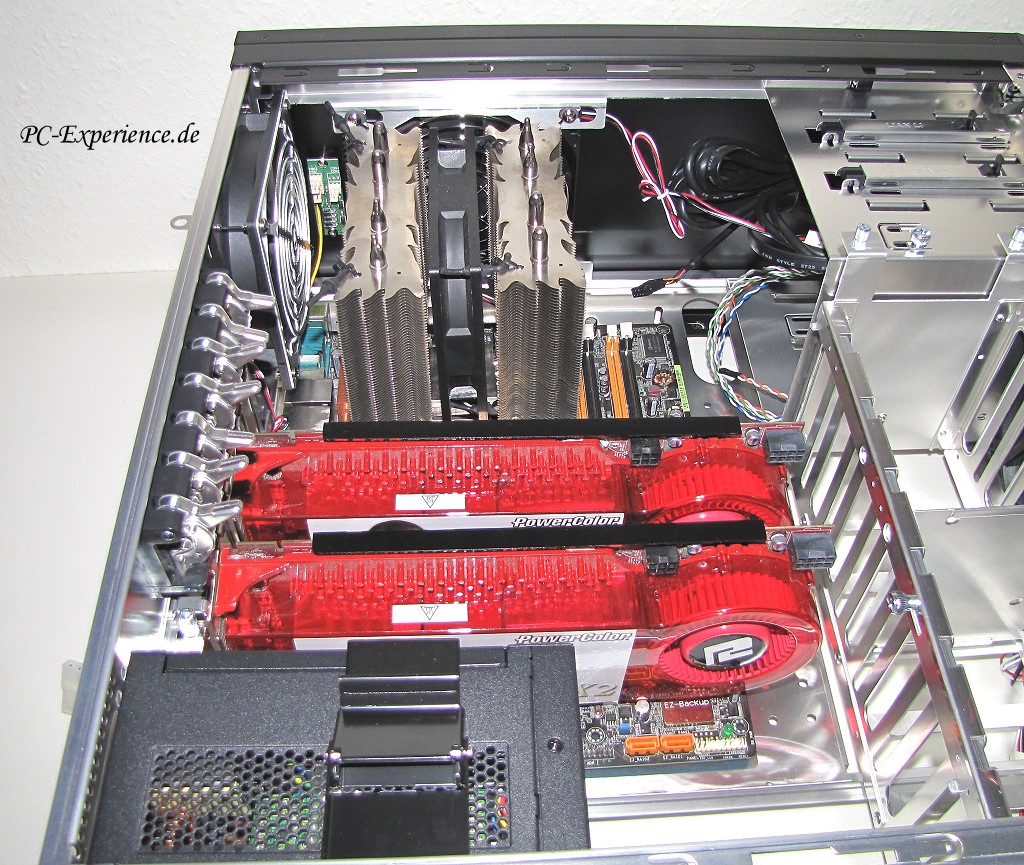 Ausladende CPU-Kühler bis zu einer Bauhöhe von 170mm und 155mm Breite sind je nach Mainboard Layout sicher unterzubringen, bei dem IFX-14 Kühler von Thermalright muß allerdings auf den HR10 Zusatzkühler verzichtet werden. Grafikkarten bis 285mm Platinenlänge (Stromanschlüsse beachten !) passen ebenso, wie Netzteile mit einer Gehäusetiefe von bis zu 230mm und darüber hinaus. Wer gerne einen besonders breiten CPU-Kühler einbauen möchte (über 150mm), sollte den 140mm Lüfter im Gehäusedeckel im Auge behalten, der wäre sonst im Weg.