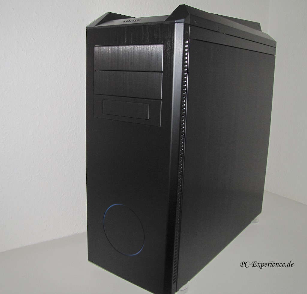 Für das Kontrolpanel oder auch I/O-Panel wurde wie gewohnt der vordere Gehäusedeckelbereich ausgewählt, eine gute Entscheidung, denn so ist die Erreichbarkeit auch in engen Schreibtischkonstellationen gewährleistet. Die Ein-Ausschaltknöpfe sind ebenso aus Aluminium gefertigt worden und wechseln sich in ihrer Aktivitätsbeleuchtung ab, d.h. separate LEDs für Power-On und die Festplatten sind nicht mehr vorhanden. Technisch wurden alle Register gezogen, eSATA fehlt ebenso wenig wie USB 3.0 (2 Ports), auch wenn viele Mainboards dies noch nicht nativ unterstützen.